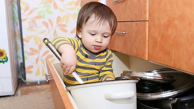 Il est bon de se mettre à la hauteur de l’enfant et de parcourir soi-même toutes les pièces de la maison à quatre pattes. Vous verrez ainsi mieux les objets que vous pourriez saisir, ce qui est intéressant vu d’en bas, les endroits présentant des coins et des arêtes vives, ou dangereux dans le ménage. Mettez tous les objets dangereux et pointus hors de portée de l’enfant. La cuisine, les portes, les fenêtres, les escaliers, les appareils électroniques et les arêtes vives sont généralement des facteurs de risque, plus susceptibles d’entraîner des accidents. Vous devez également veiller à ce qu’aucun objet ne puisse tomber des étagères lorsque vous les heurtez. Les téléviseurs à écran plat, par exemple, peuvent facilement basculer s’ils ne sont pas correctement fixés.
