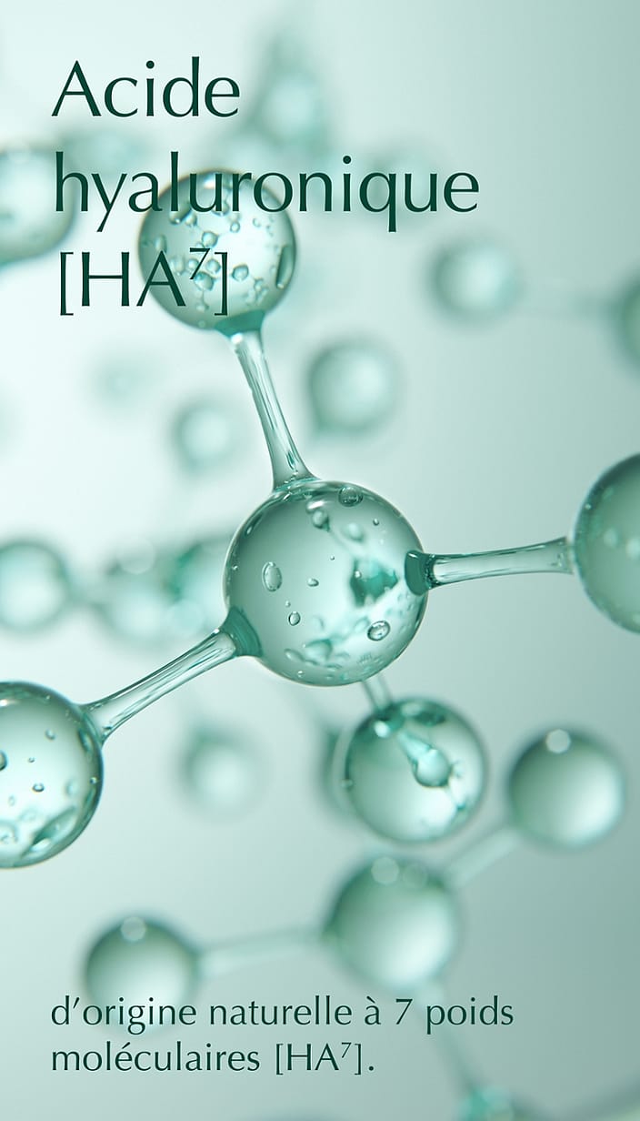 • Acide hyaluronique d’origine naturelle à 7 poids moléculaires [HA⁷] : Offre une hydratation immédiate et durable.