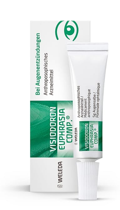 Bei geröteten und tränenden Augen, Schwellungen, Juckreiz, Brennen oder Schmerzen und/oder Krustenbildung am Lid kann Visiodoron Euphrasia comp.® Augensalbe helfen. Die Augensalbe wird deshalb bei Augenentzündungen wie Bindehautentzündung oder Gerstenkorn eingesetzt. Die Wirkstoffe Euphrasia officinalis, Euphrasia stricta, Calendula officinalis und Echinacea angustifolia sind aus eigenen Gärten, Bio-Anbau oder nachhaltiger Wildsammlung. Die Kombination aus Euphrasia, Calendula und Echinacea wirkt antientzündlich und fördert den Heilungsprozess.